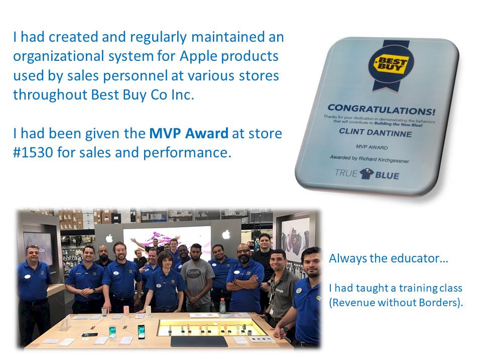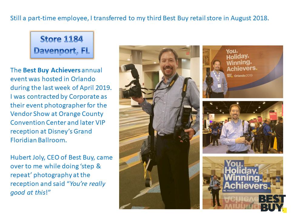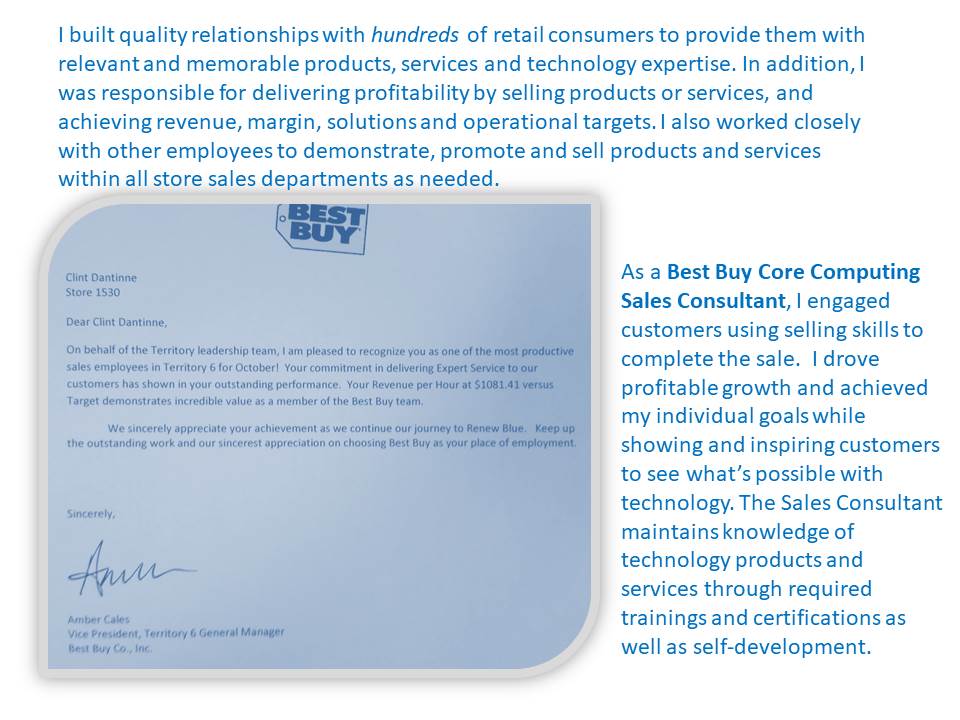 Senior Sales Consultant Part-time Aug 2014 – Oct 2019 Delaware and Florida • Computer Sales & Gaming, BBY store #1184 Davenport, Florida; Aug 2018 – Oct 2019 • Computer Sales & Apple Store, BBY store #1530 Orlando, Florida; Aug 2018 – Oct 2015 • Computer Sales, & Microsoft Store, BBY store #465 Wilmington, Delaware; Oct 2015 – Aug 2014