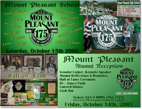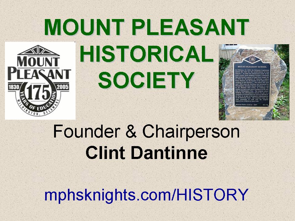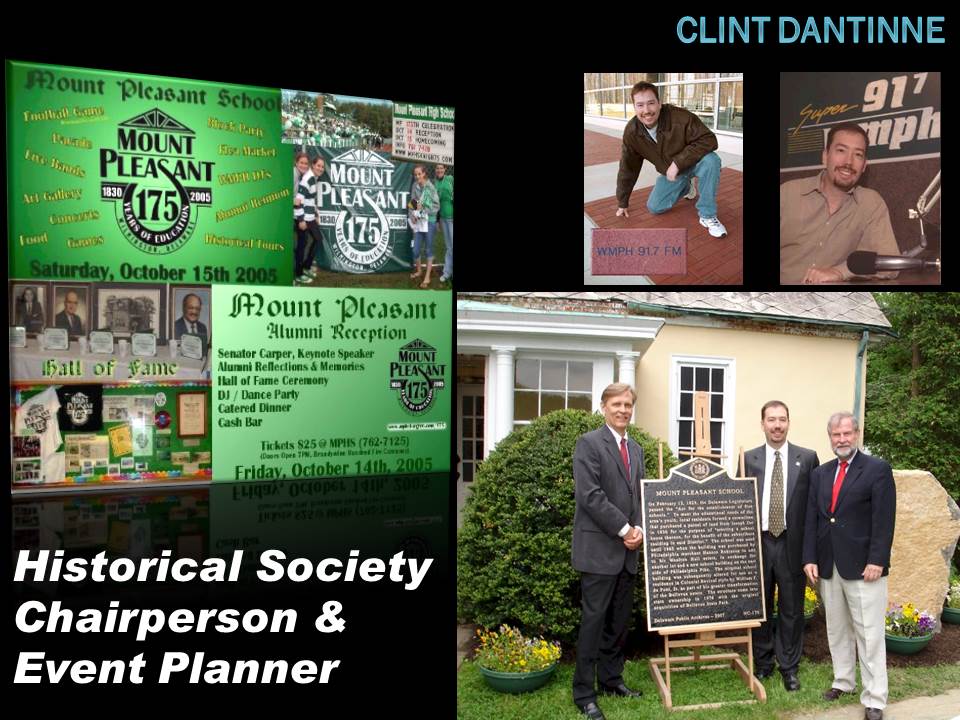 – Founder of the Mount Pleasant Historical Society and chairperson for the 175th anniversary celebration Oct 2005, historical marker dedication May 2007, and high school building 50th anniversary ceremony Oct 2008 (historian, curator) and co-founder of Mount Pleasant Hall of Fame (Emcee/DJ for induction ceremonies 2005, 2007, 2009, 2011, 2014)