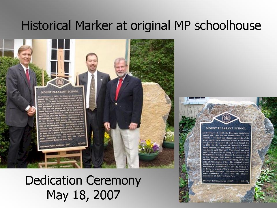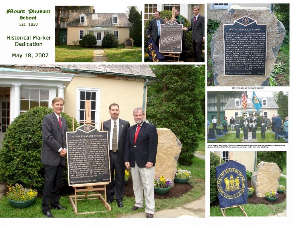I was responsible for a State of Delaware historical marker to be erected at the original 1830 schoolhouse. I also collaborated with the county library for a WMPH 91.7 FM brick to be placed in their honorary walkway.
