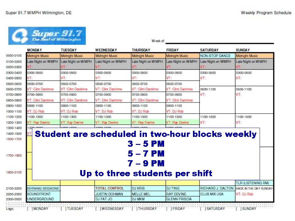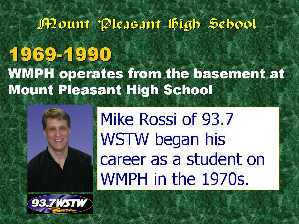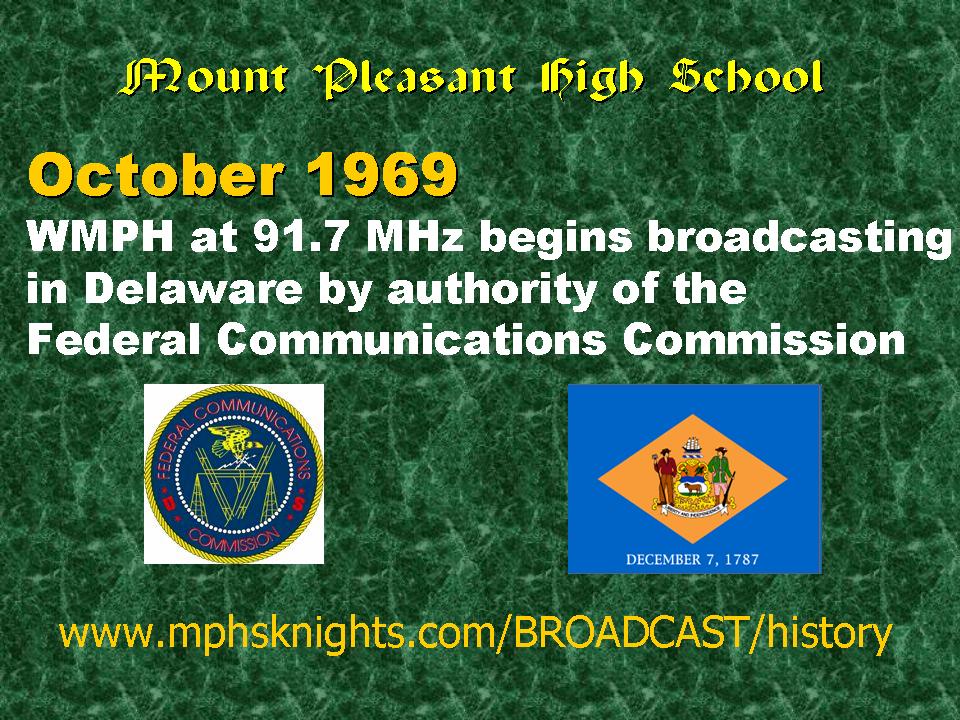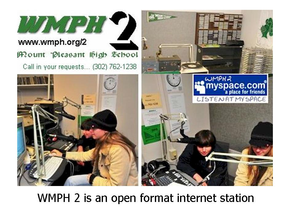 I taught Radio Workshops (PDF) each semester to students of Mount Pleasant, Brandywine and Concord High Schools. WMPH aired educational features (PDF) and public service announcements as scheduled on the daily program log.