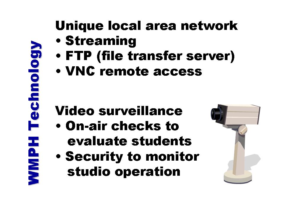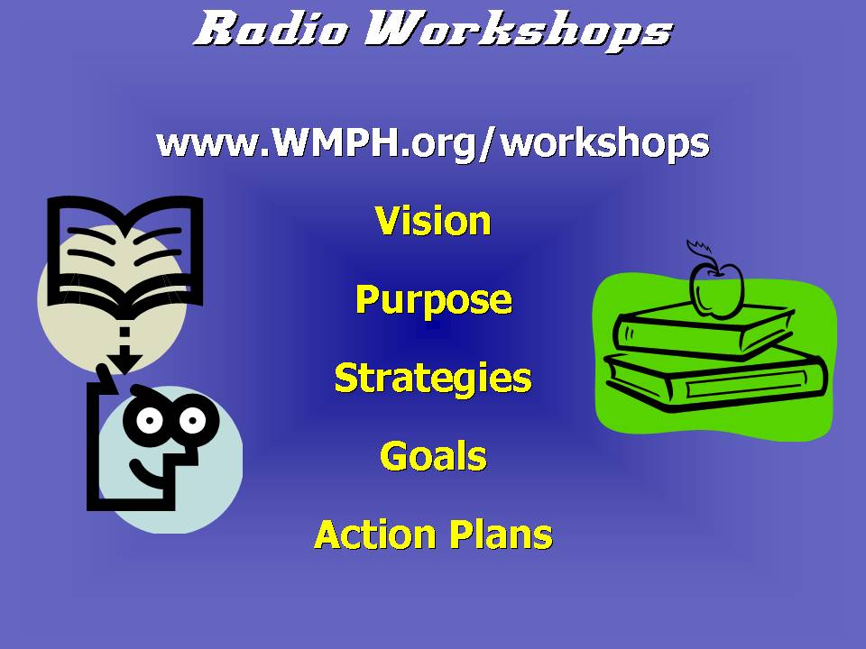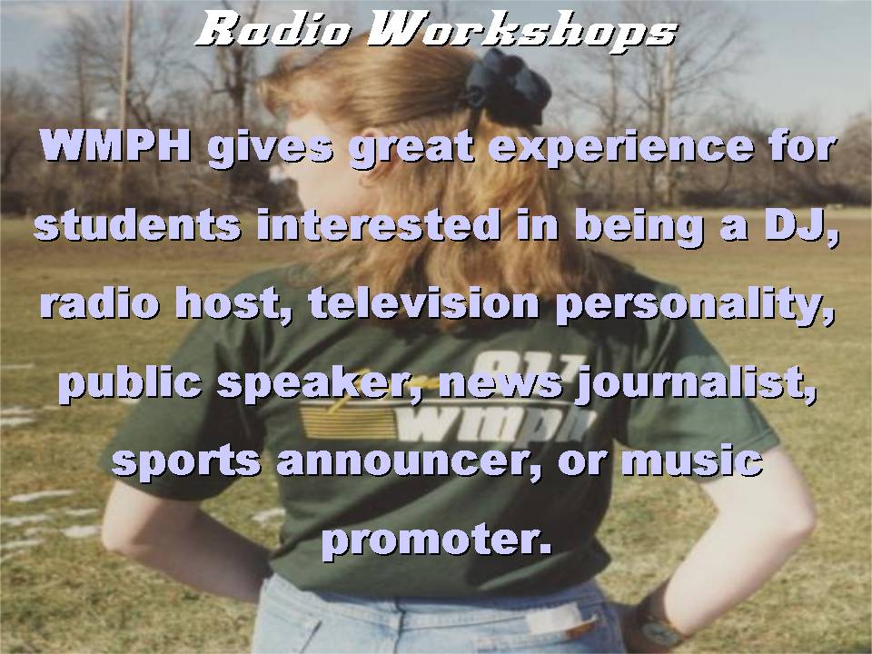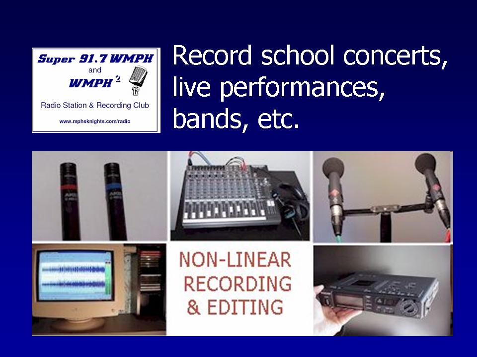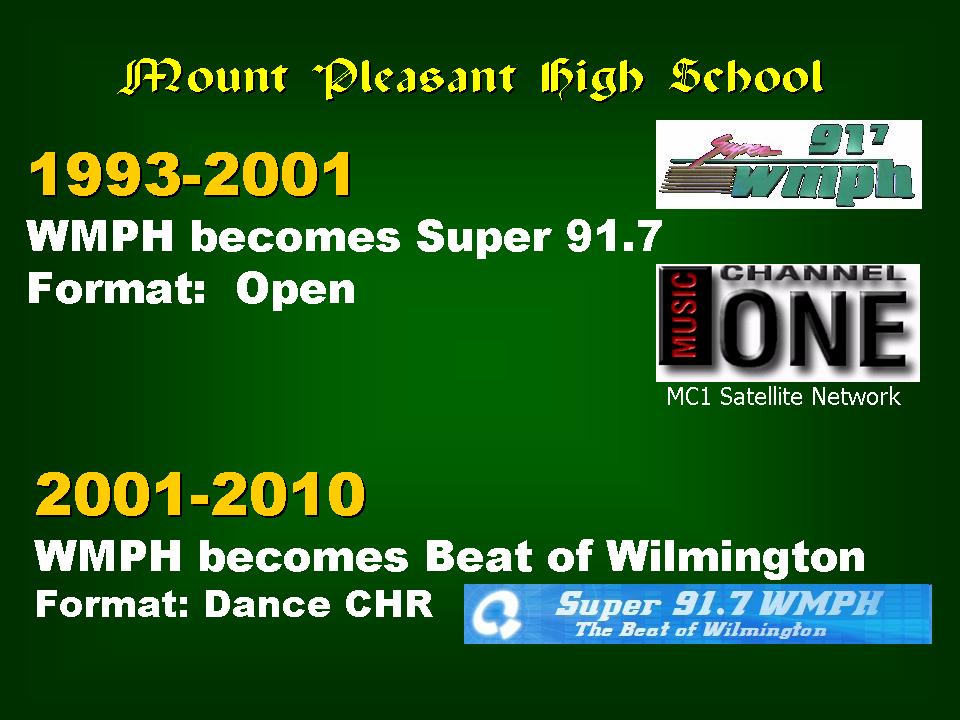 I taught Radio Workshops (PDF) each semester to students of Mount Pleasant, Brandywine and Concord High Schools. WMPH aired educational features (PDF) and public service announcements as scheduled on the daily program log.