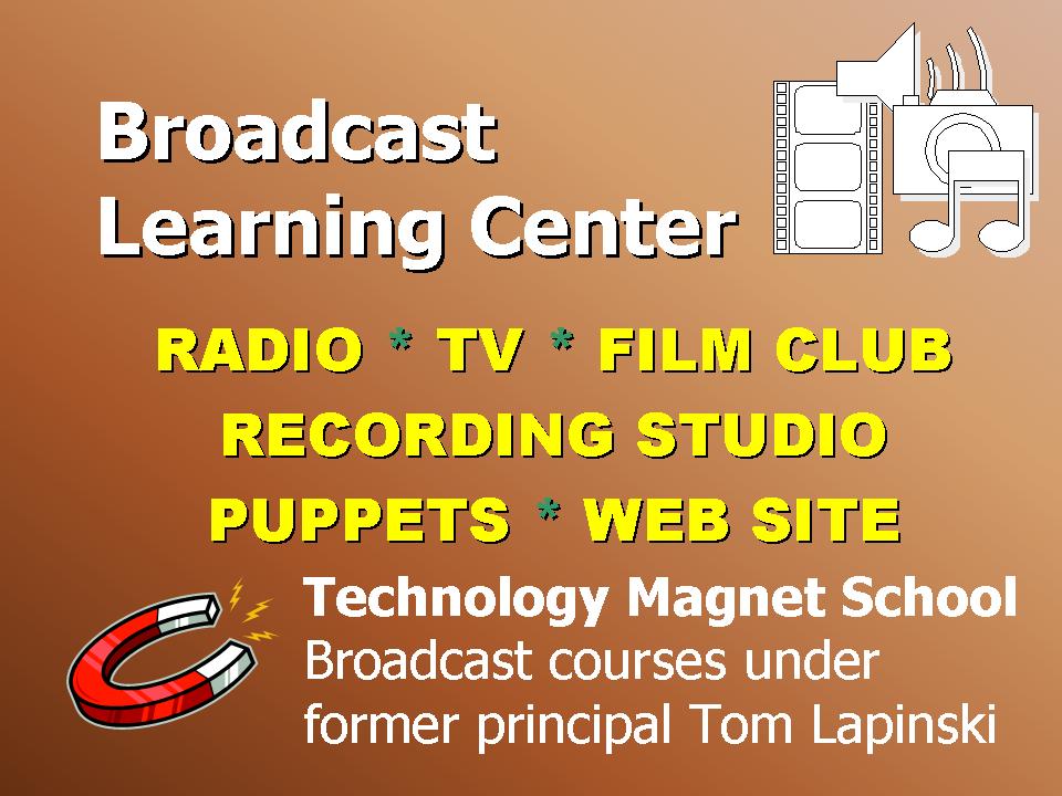 – Founded the Broadcast Learning Center incorporating radio, television, film club, recording studio, puppets, newspaper, and web team at Mount Pleasant High School