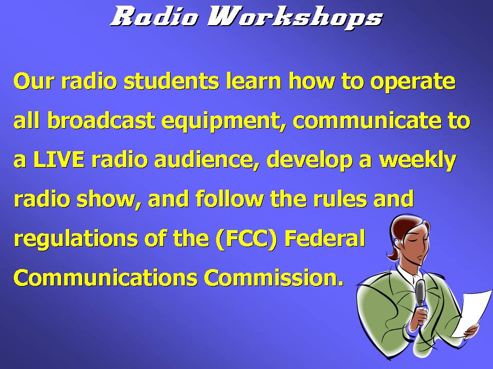 – Develop curriculum and teach student workshops for communications theory, broadcast technology, and journalism
